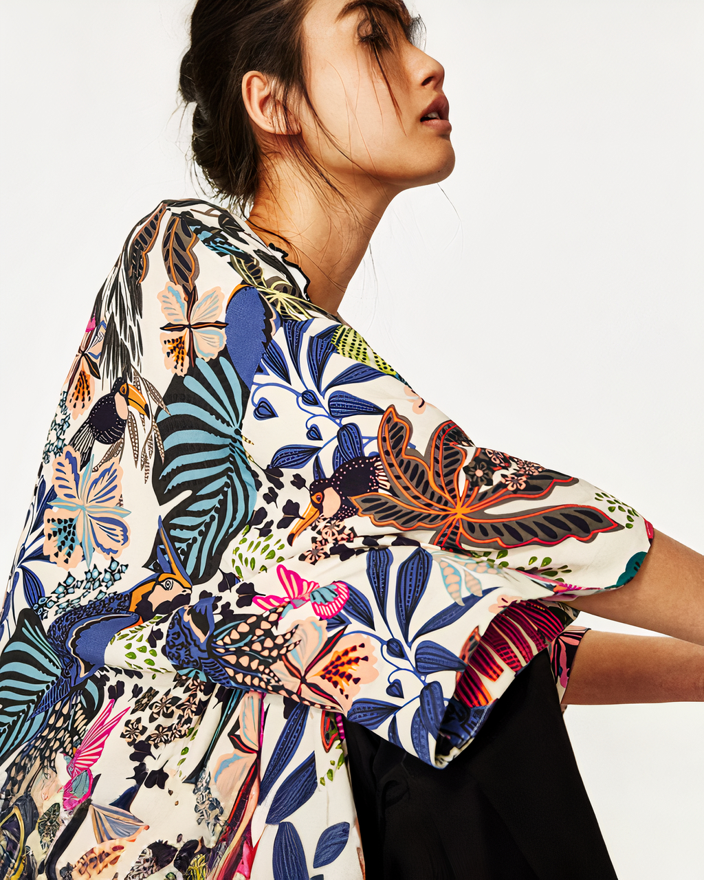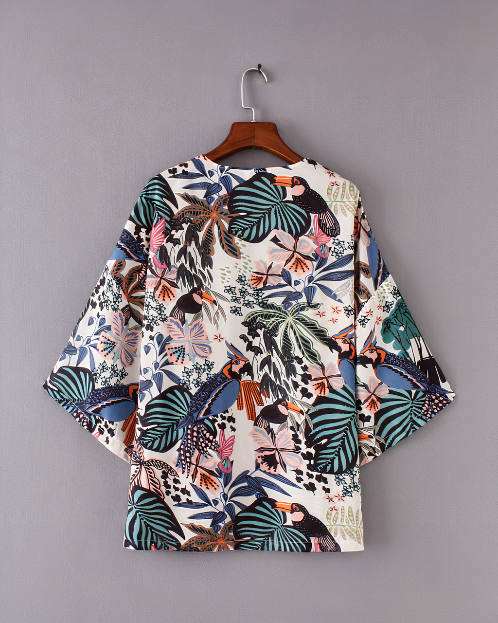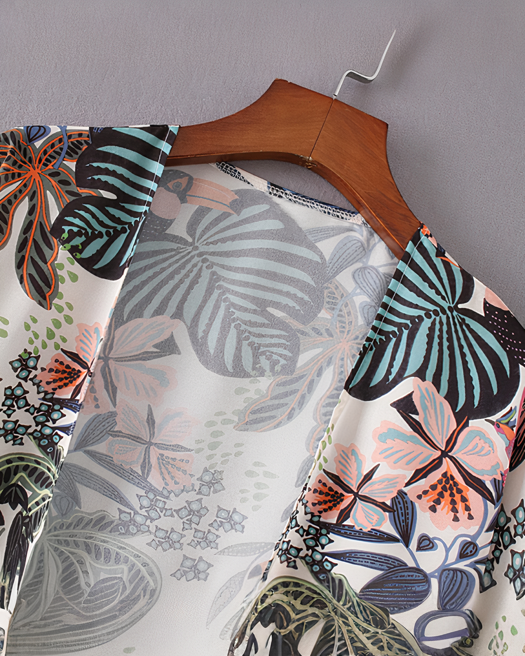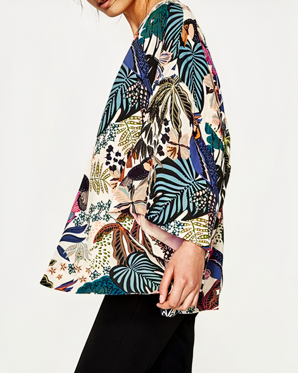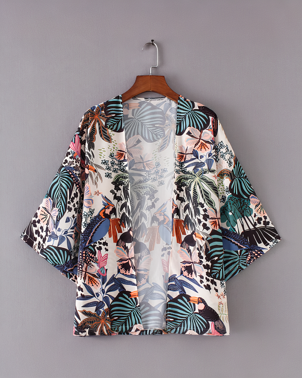 Ne vous sentez pas obligée de traverser le monde pour trouver des vêtements qui vous plaisent ! Optez pour ce joli kimono court blanc imprimé au motif des forêts tropicales.