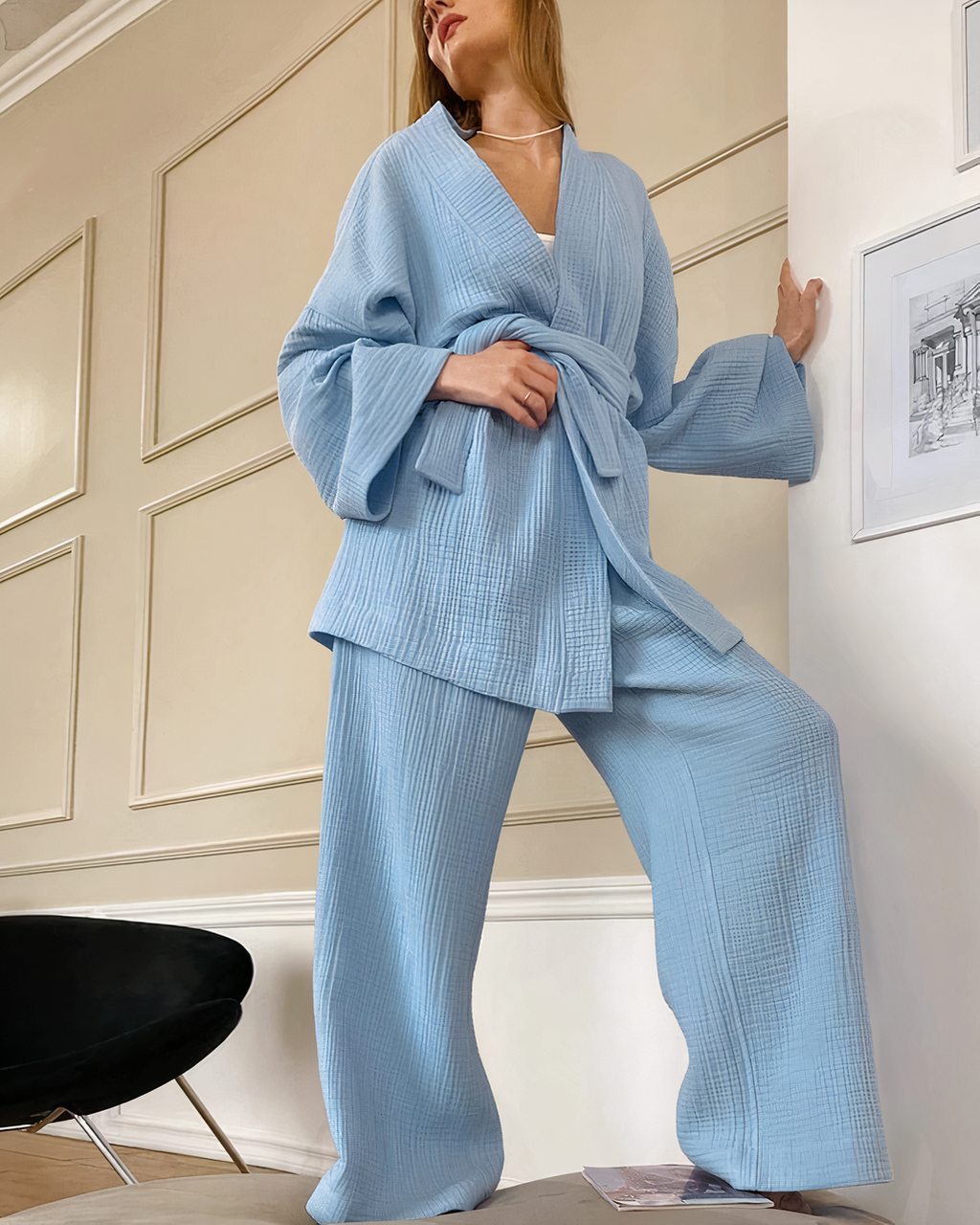 Vous cherchez quelque chose de spécial à porter lors de votre prochaine soirée ? Découvrez notre ensemble kimono court femme en crêpe uni bleu ciel. Ce magnifique ensemble comprend un kimono court à manches longues, un décolleté en V profond et une ceinture qui resserre la taille. Le pantalon est fabriqué dans le même magnifique crêpe bleu ciel et a une taille élastique pour un ajustement confortable. Cet ensemble est parfait pour toute occasion formelle ou semi-formelle.