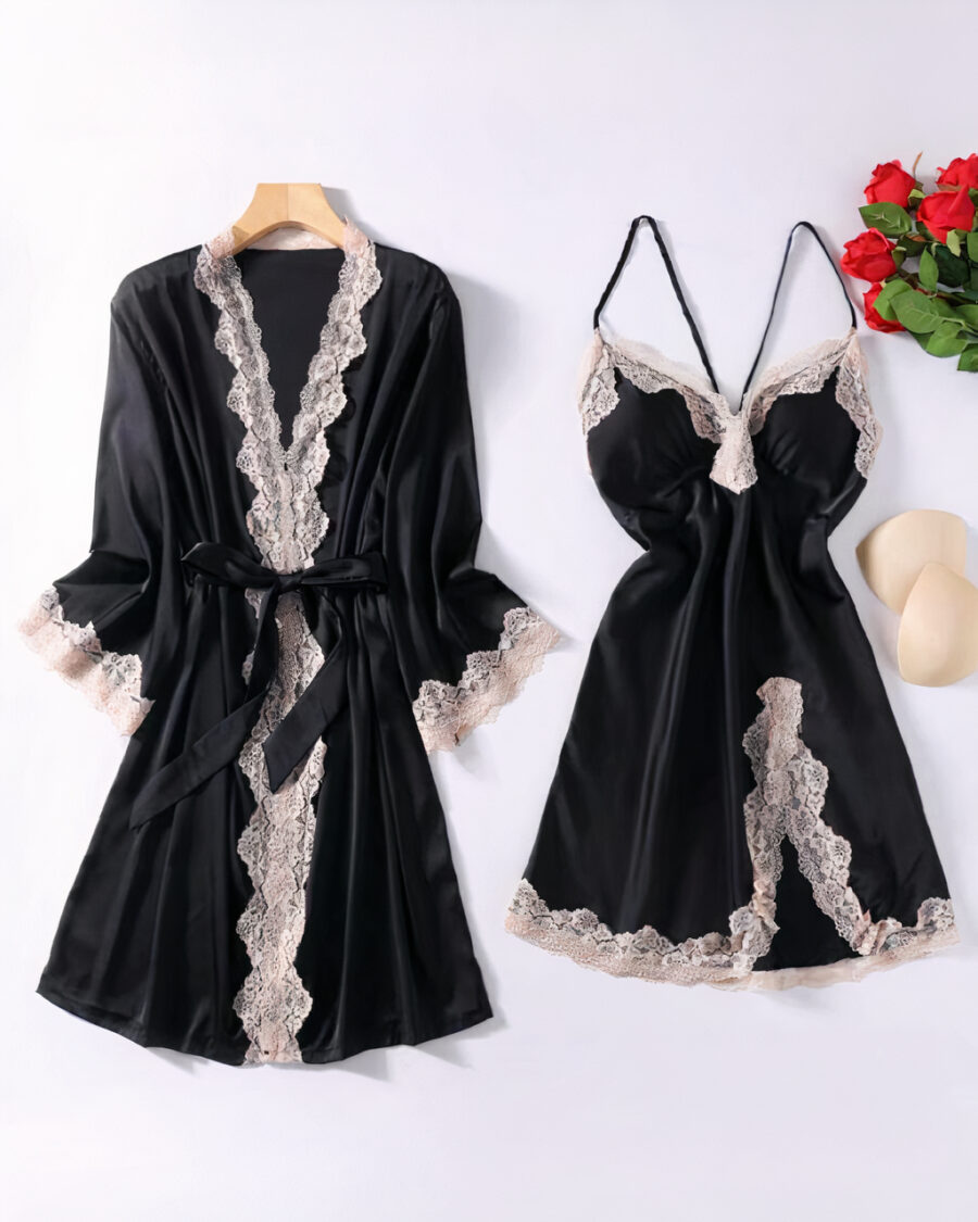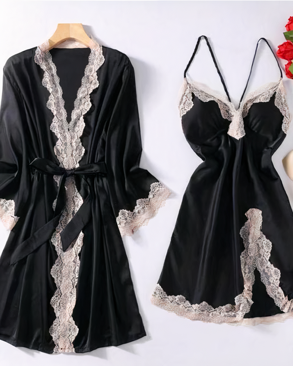 Nous sommes enthousiastes de vous présenter notre kimono et nuisette d’été noire pour femme. C’est un ensemble pyjama à la mode et confortable. Ces 2 pièces sont adaptées à être portées lors des journées chaudes, car elles sont courtes, légères et respirantes.