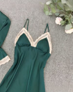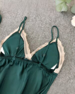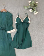 Ce nouvel ensemble kimono et nuisette vert pour femme est une paire parfaite de vêtements de nuit à la fois élégantes et confortables ! Profitez d’une excellente nuit de sommeil avec cet ensemble pyjama magnifique. Son col en V de la robe de chambre et l’ourlet du peignoir kimono sont ornés de dentelles pour une touche de style.