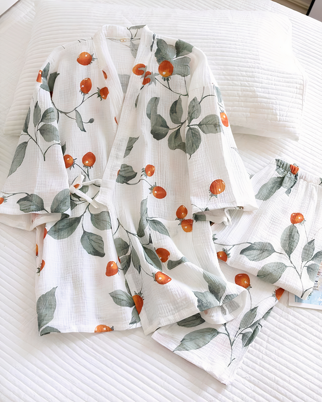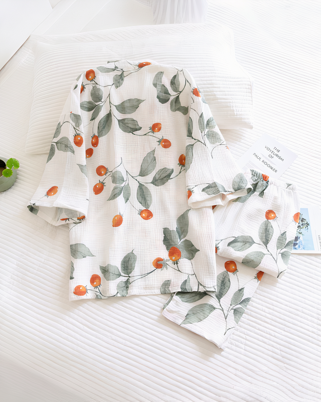 Ce joli ensemble de pyjama blanc est composé d’un haut ajustable et d’un pantalon mi-long. Les motifs fraisier font de ce pyjama un vêtement doux et enfantin. Il est idéal pur les journées de repos ou les nuits d’été. Le blanc est une couleur calme qui invite à la sérénité et au sommeil.