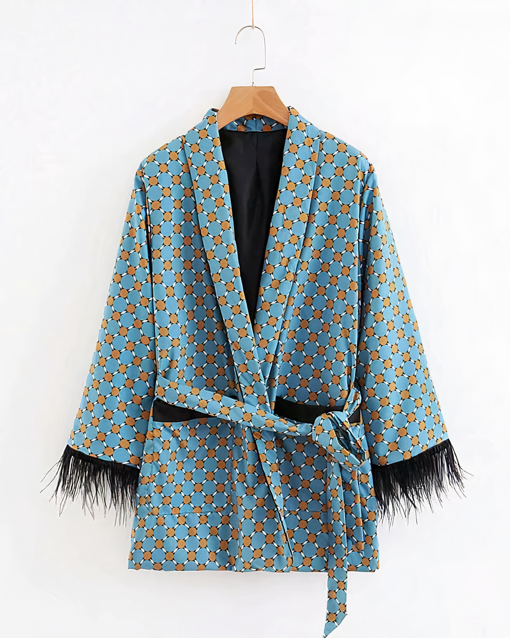 Cet ensemble pantalon kimono femme est un style élégant et féminin qui apportera une touche exotique à votre look. La coupe ample et fluide de la veste à manches longues et serrée aux poignets agrémentée de plumes en cascades sur la partie haute crée une silhouette ultra-féminine. Le pantalon assorti à taille haute arbore un joli imprimé bleu rappelant les motifs japonais, dont la ligne asymétrique verticale lui donne du caractère, tandis que le ruban décoratif argenté ajoute une touche raffinée.