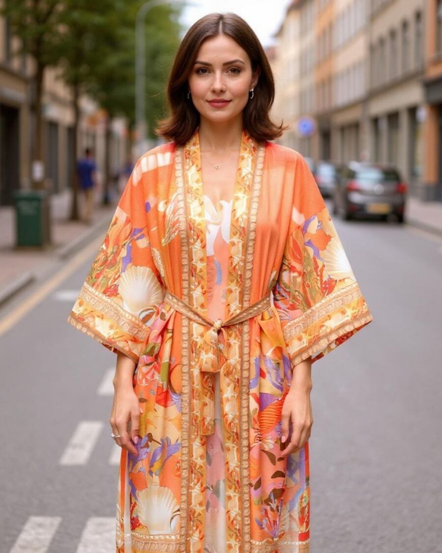 Ce joli kimono oranger est un vêtement que vous vous pourrez porter avec tous les vêtements qui vous plaisent dans votre garde-robe. Vous allez l’adorer !