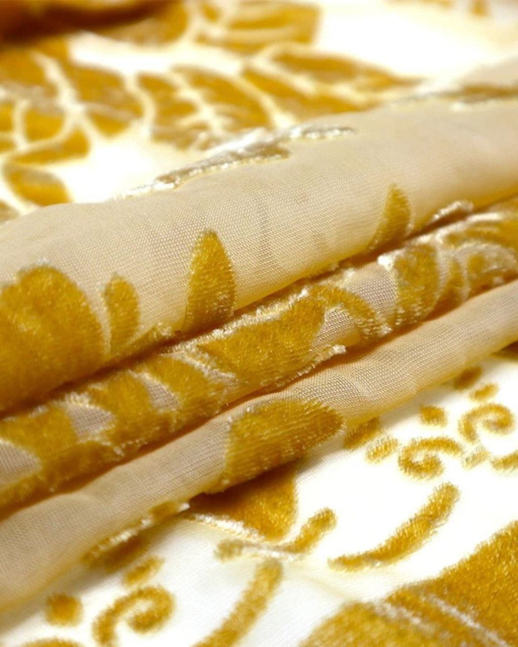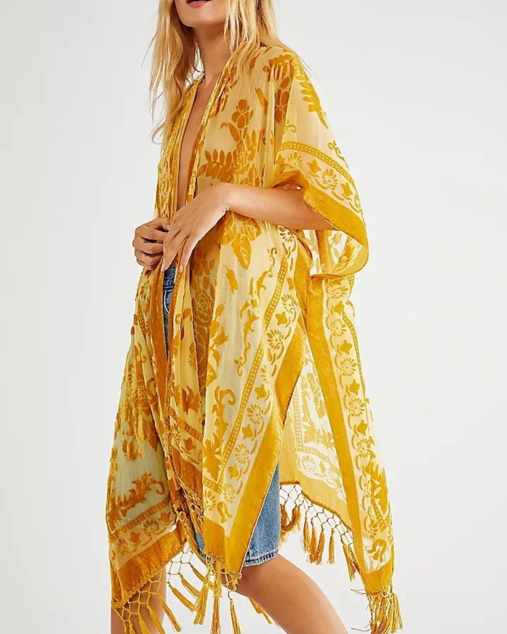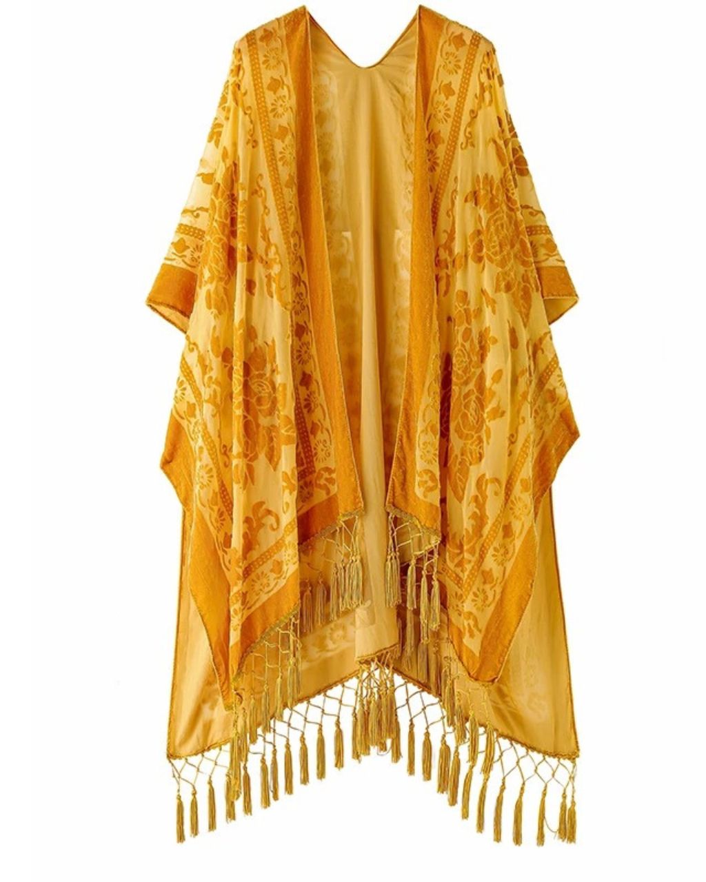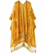 Laissez-vous envoûter par l’aura singulière de ce kimono bohème jaune à pompons. Son tissu légèrement transparent caresse la peau, ses fleurs en velours dessinent des arabesques sensuelles, et les pompons ajoutent une touche espiègle à chaque mouvement.