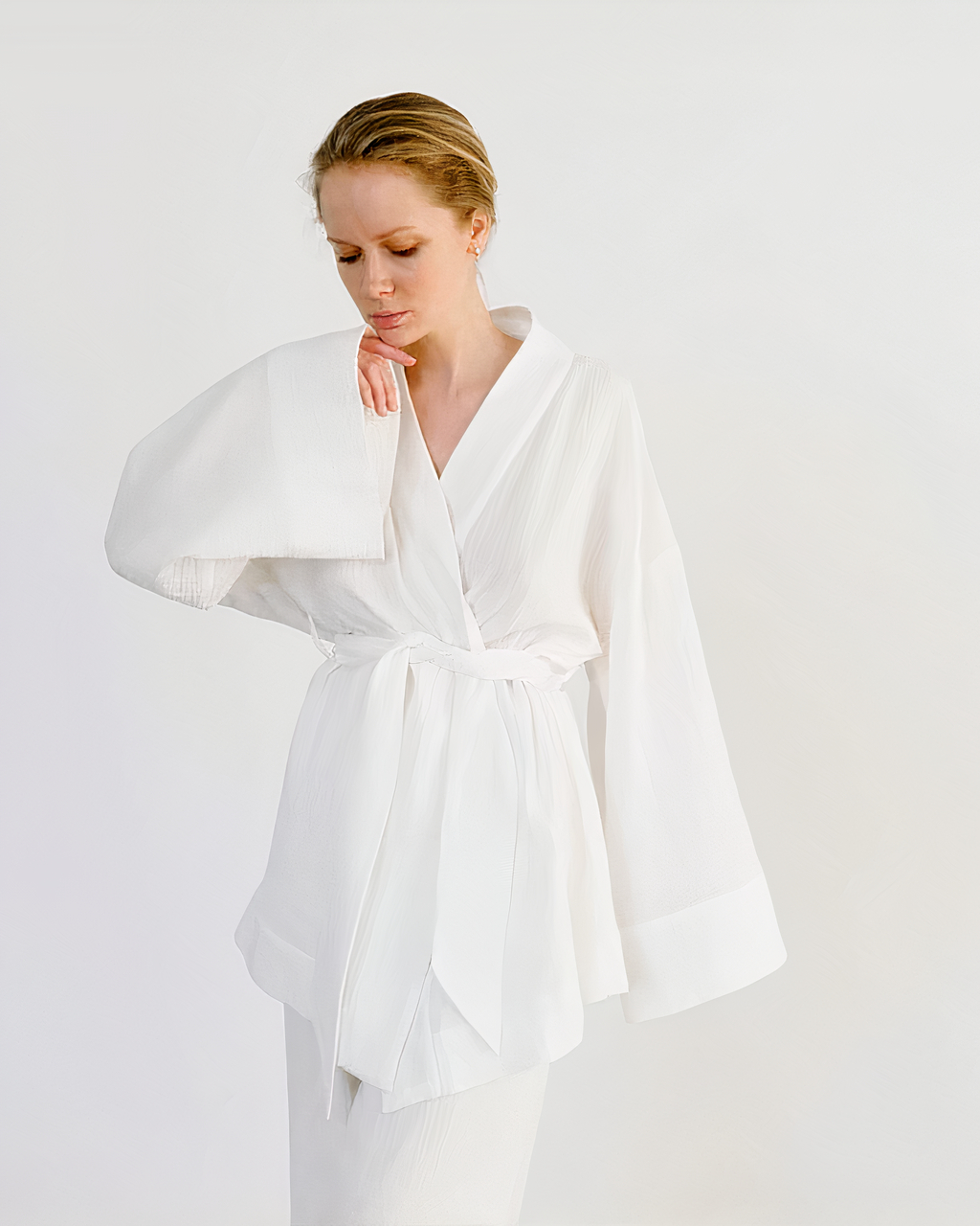 Vous recherchez un ensemble kimono magnifique et polyvalent qui peut être porté en toute occasion ? Ne cherchez pas plus loin que notre ensemble kimono court femme en crêpe uni blanc. Cet ensemble comprend un haut de kimono court et un pantalon assorti, tous deux confectionnés dans un luxueux tissu crêpe. Le haut a une silhouette ample et fluide, avec des manches longues et un devant ouvert qui crée un drapé élégant. Le pantalon a une coupe ajustée avec une jambe droite et une taille élastiquée pour plus de confort. L’ensemble est parfait pour les journées chaudes, que vous vous habilliez de manière élégante ou décontractée. Habillez-le avec des talons et des bijoux pour une soirée, ou restez décontractée avec des chaussures plates et une veste en jean. Quelle que soit la façon dont vous le portez, vous serez chic et vous vous sentirez fabuleuse.