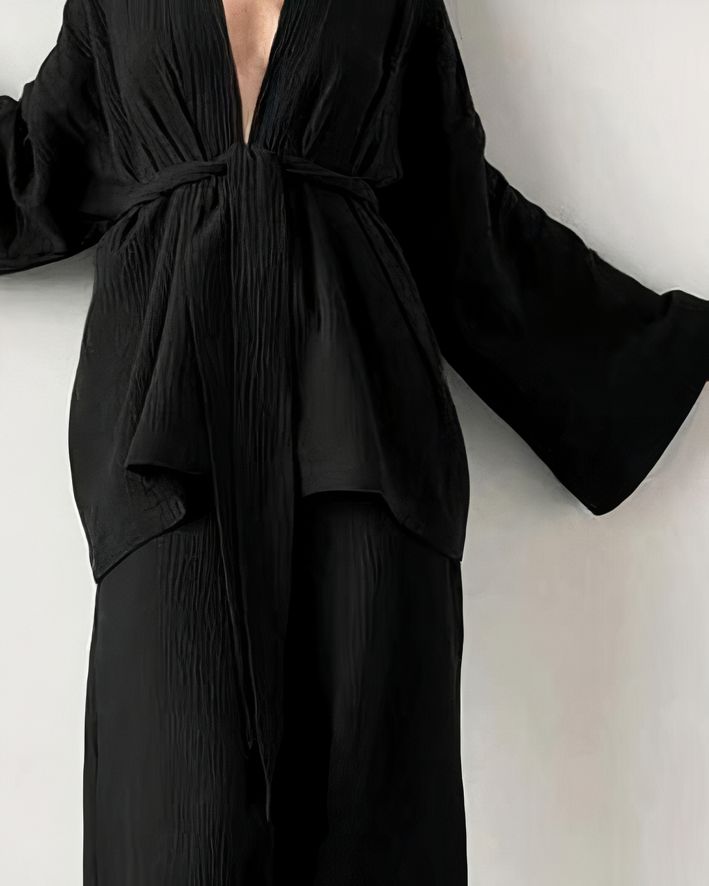 Voici notre nouvel ensemble kimono court pour femme en crêpe noir uni ! Cet ensemble luxueux et élégant est parfait pour toute occasion spéciale ou pour une soirée en ville. Le haut kimono est fabriqué dans un magnifique tissu crêpe noir, avec des manches longues et une encolure en V flatteuse. Le pantalon assorti est également fabriqué en crêpe noir et possède une taille haute pour un ajustement confortable et élégant.