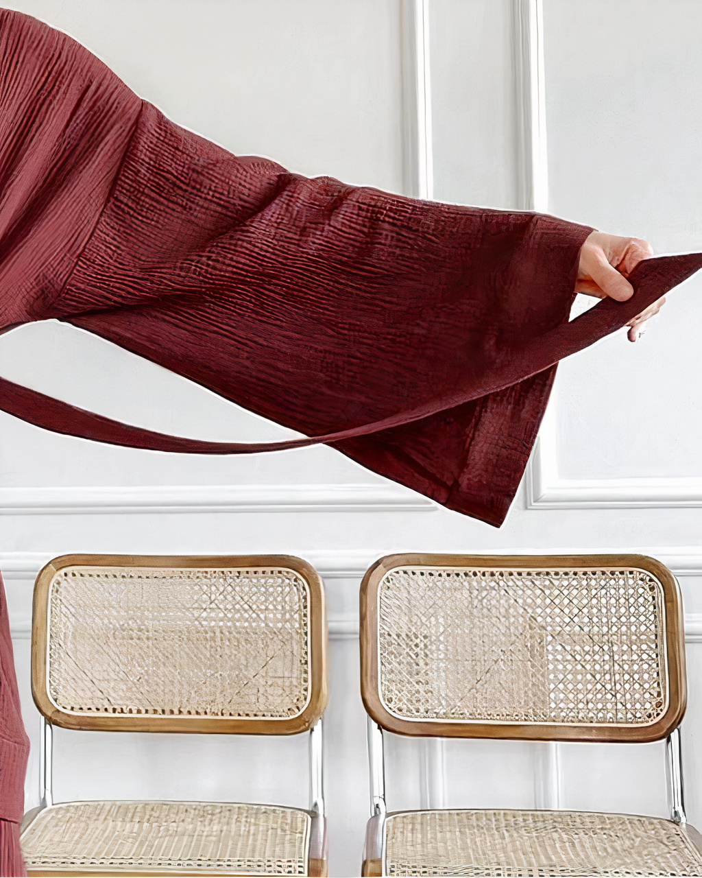 L’ensemble kimono court femme en crêpe uni rouge est le moyen idéal d’ajouter une touche de style à votre garde-robe. L’ensemble comprend un haut de kimono en crêpe rouge à manches longues et une ceinture en crêpe rouge assortie. Le haut de kimono est fabriqué en 100% coton et est lavable en machine pour un entretien facile. Cet ensemble est parfait pour toute femme qui souhaite ajouter une touche d’élégance à son look.