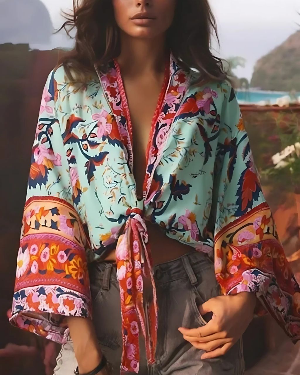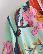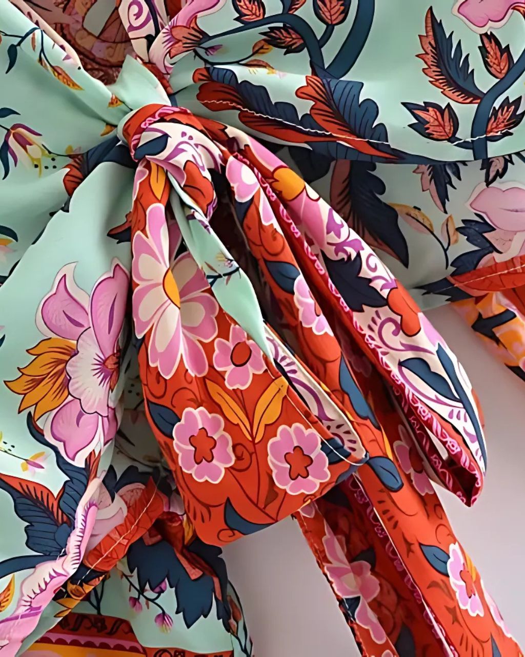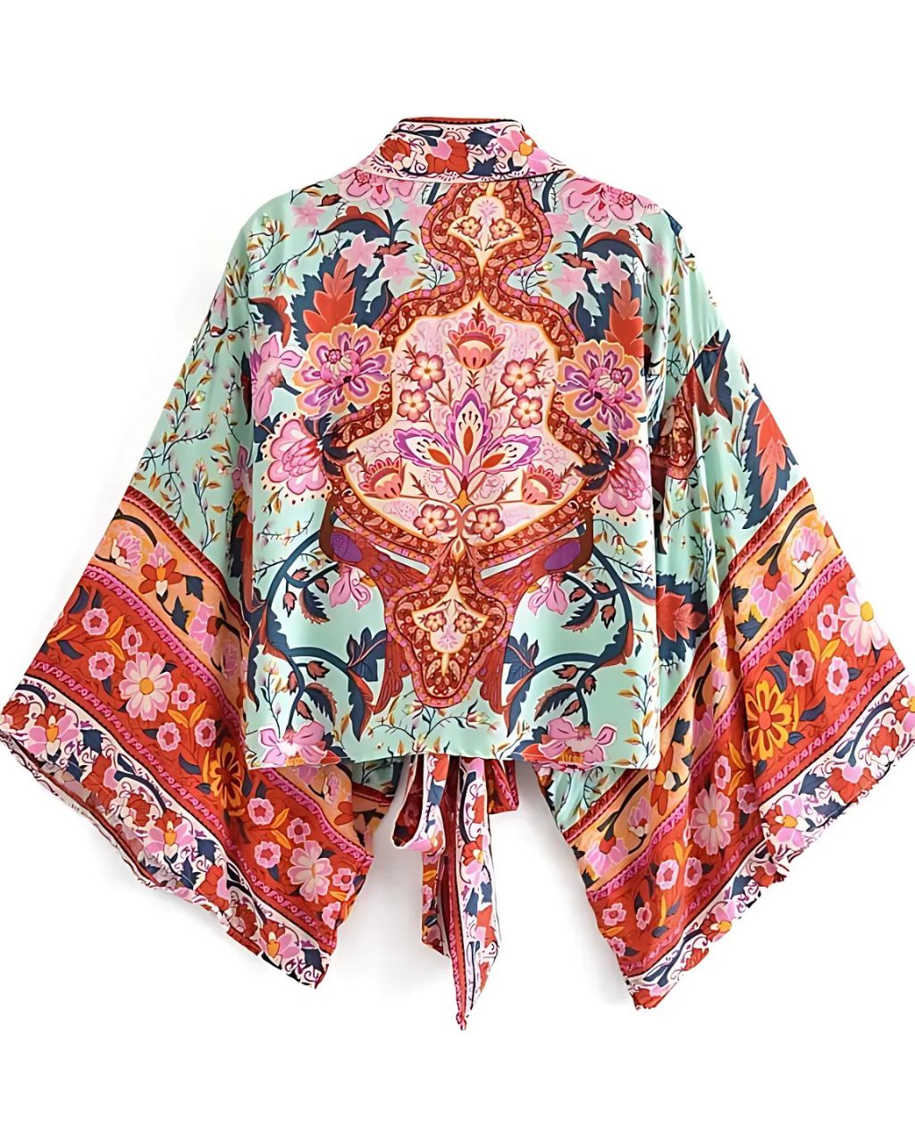 Ce kimono court boho chic se pare d’un motif floral aux touches de rouge sur fond vert, comme un jardin au petit matin. Chaque détail de l’imprimé a été pensé pour évoquer la douceur, la vitalité et la féminité.
