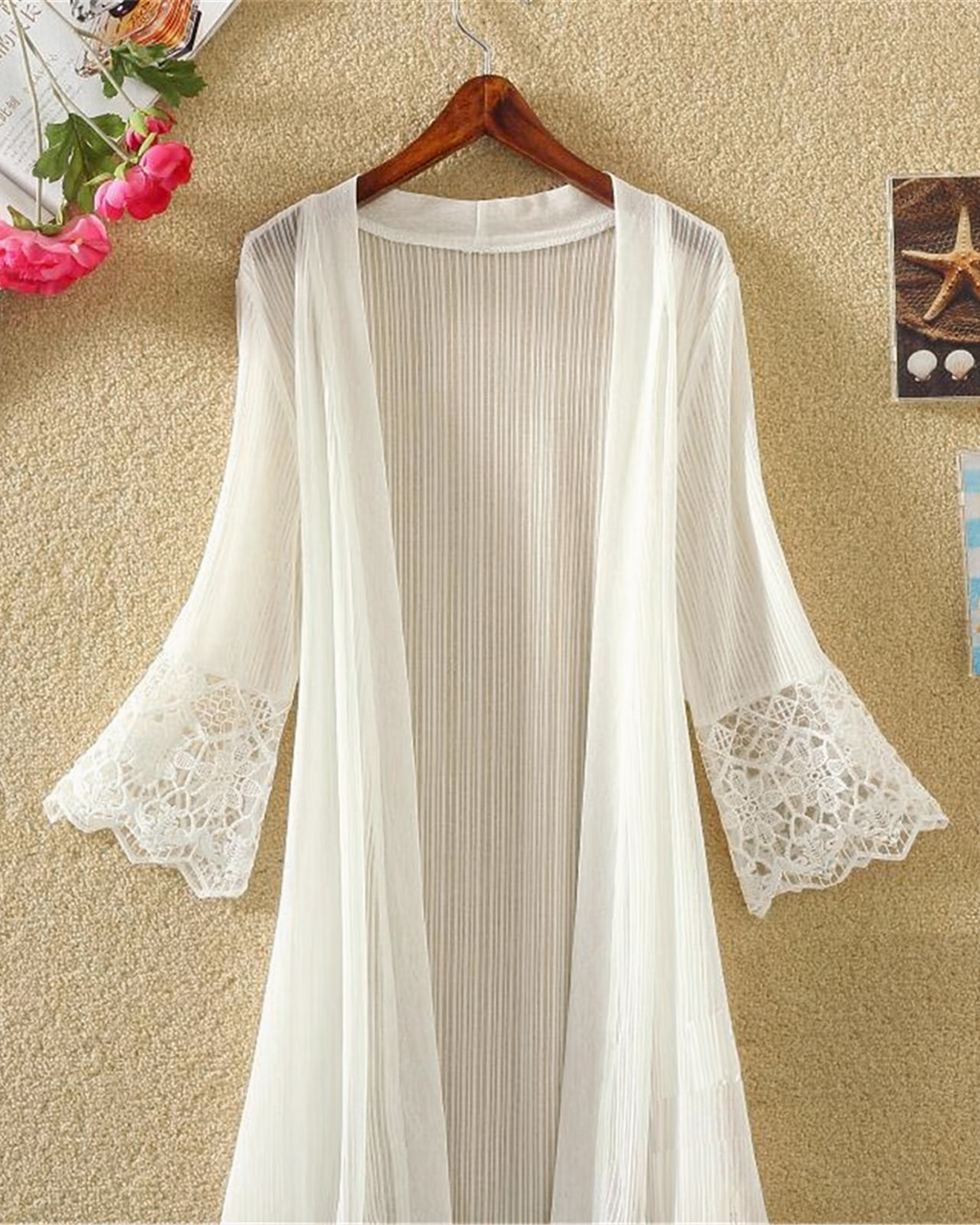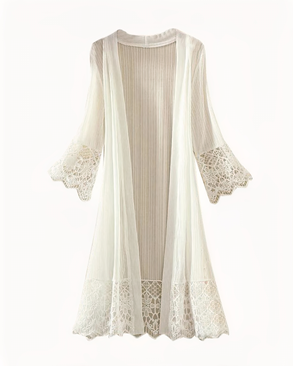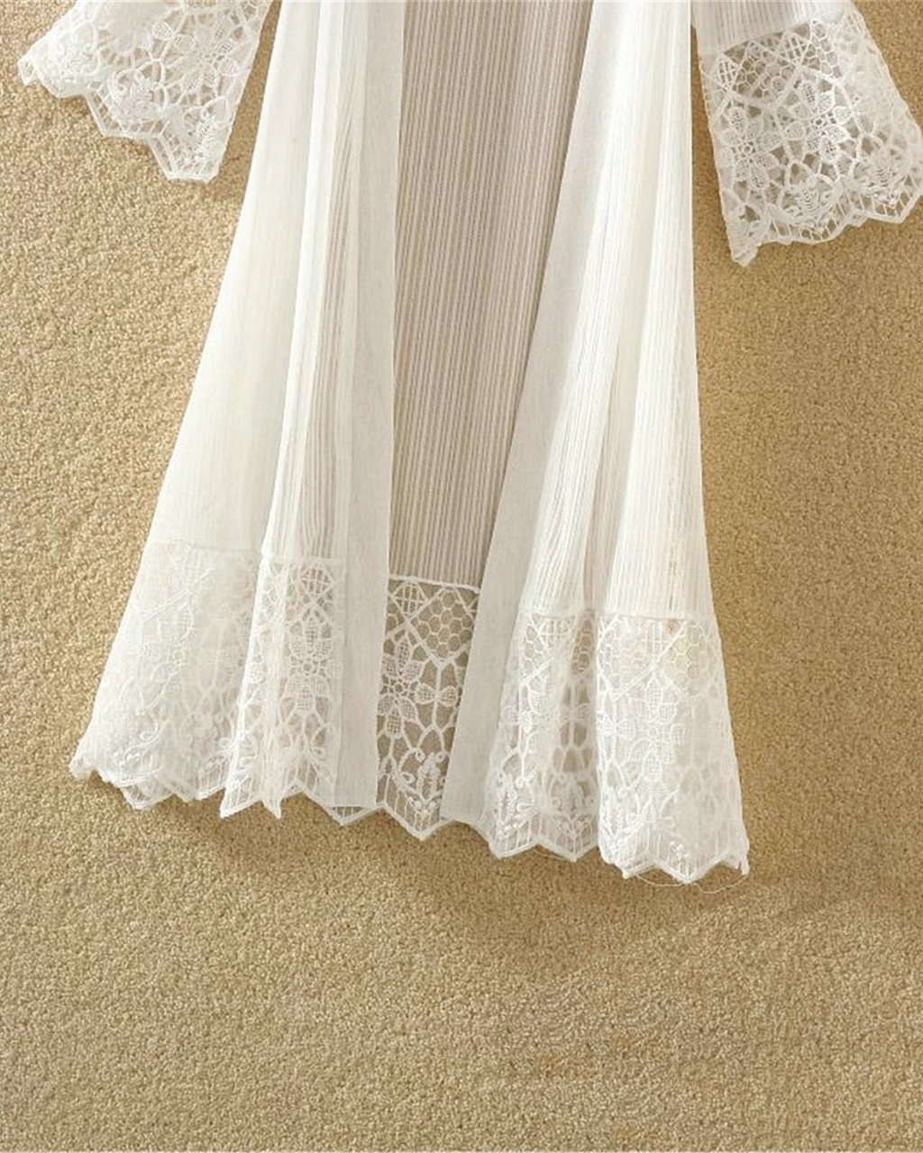 Voici notre kimono à manches longues en dentelle blanche pour femme ! Cette pièce est parfaite pour l’été et pour le printemps, et peut être habillée pour toutes les occasions ! La délicatesse de la dentelle ajoutera une touche de romantisme à n’importe quelle tenue.