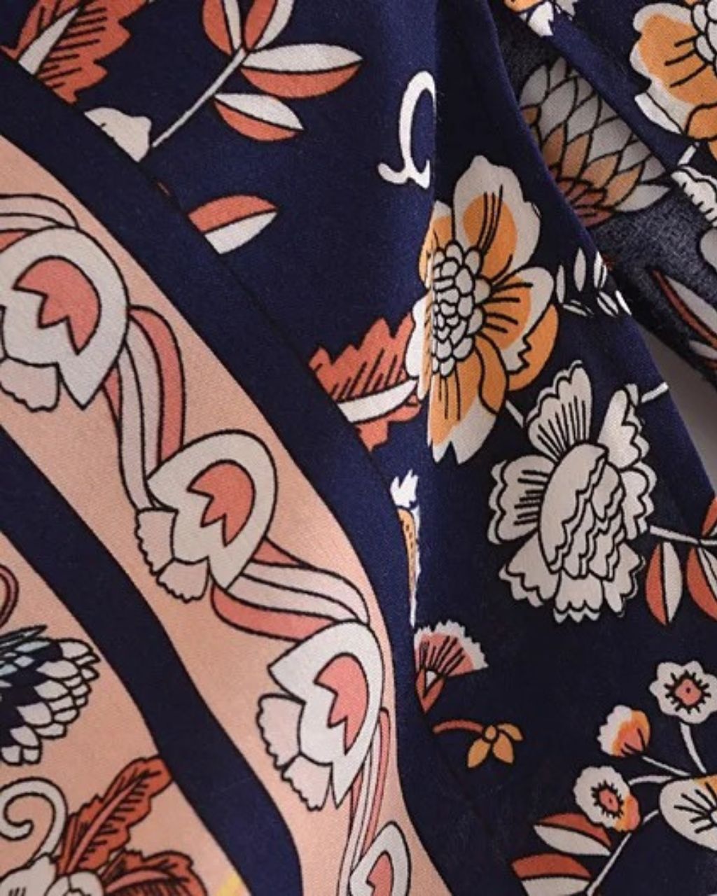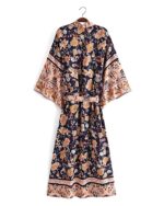 Et si chaque geste devenait une poésie, chaque mouvement une caresse ? Avec ses manches chauve-souris et sa coupe fluide, ce kimono à motif fleuri noir et beige vous enveloppe d’un souffle bohème. Il glisse avec grâce sur votre silhouette, laissant parler votre féminité libre et inspirée.
