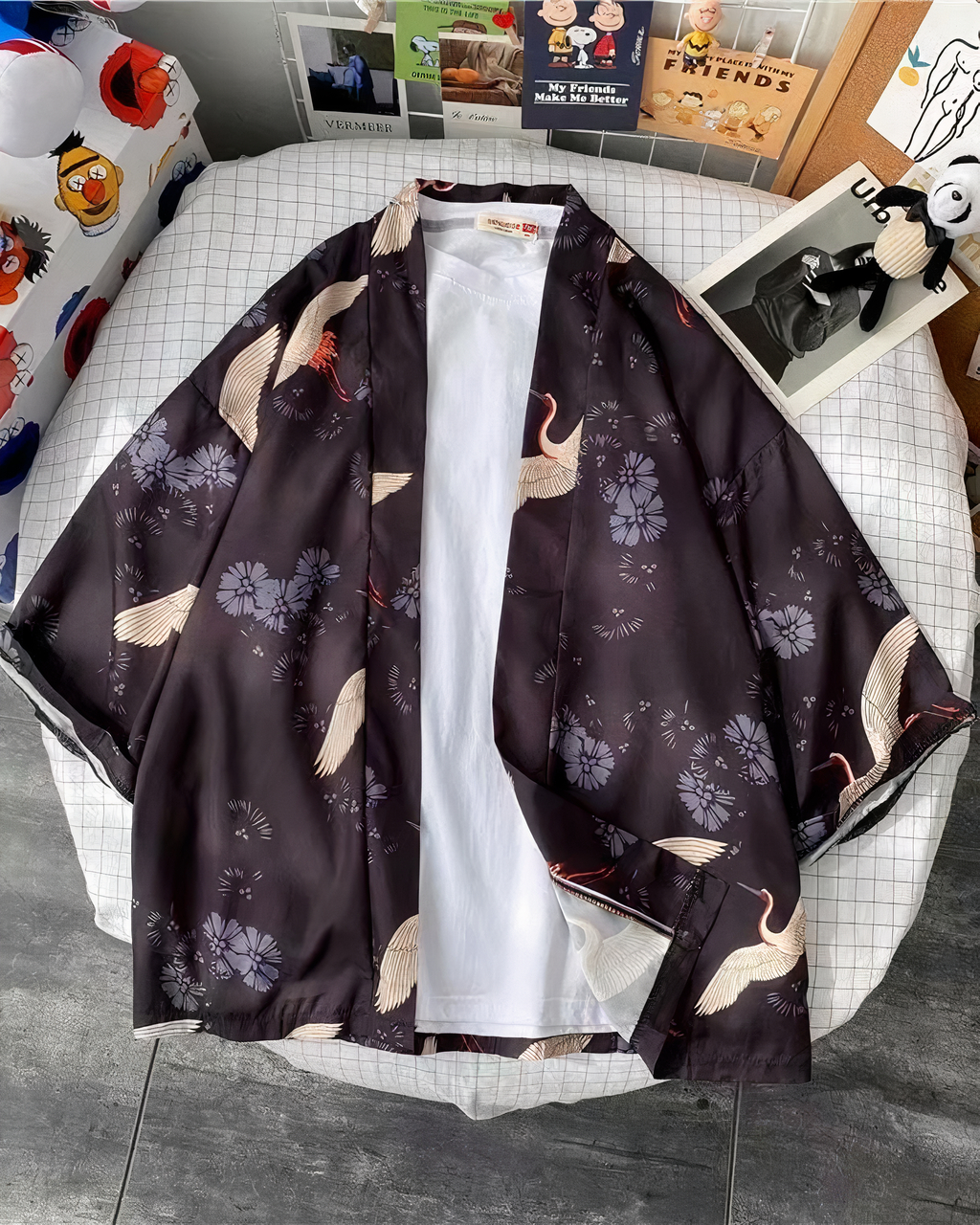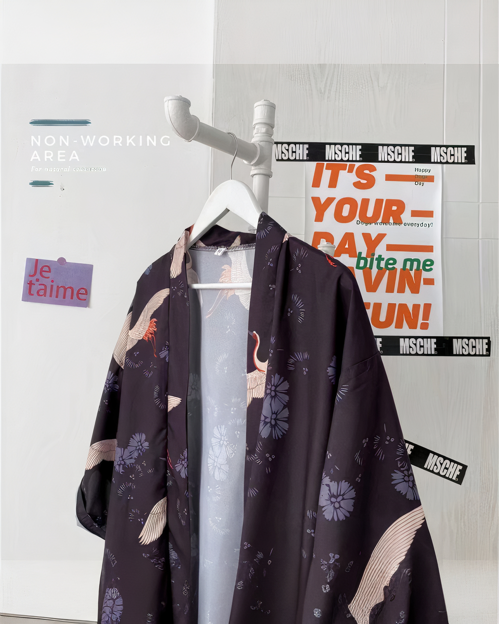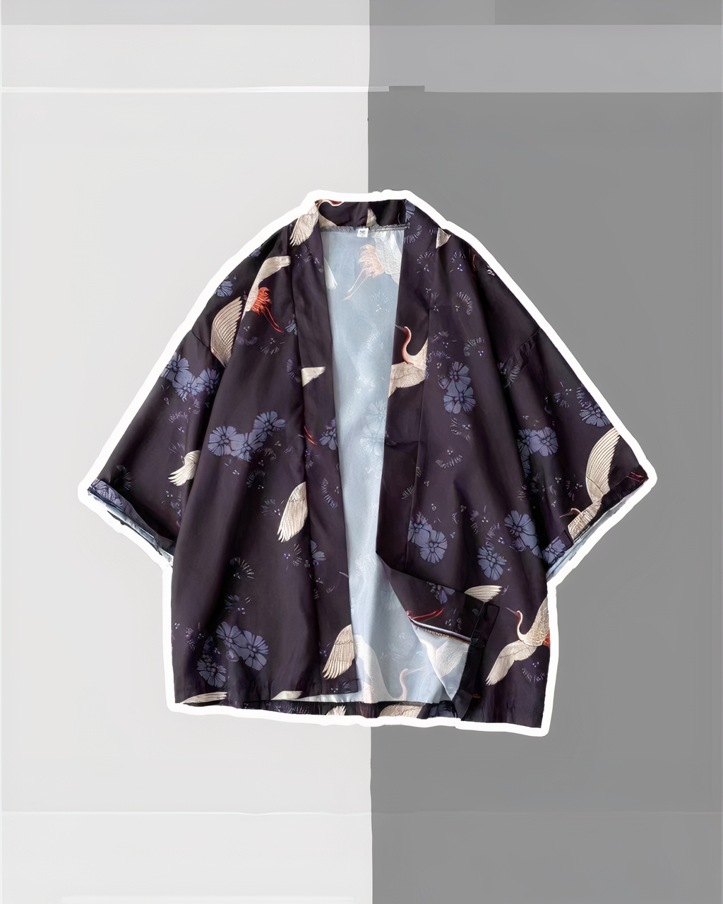 Faites un bon dans la culture japonaise, offrez-vous un kimono qui vous ressemble. Ce kimono de couleur bleu nuit représente des poissons typiques de la tradition japonaise. Sa couleur vous permet de l’allier facilement avec un jean ou une robe sombre. À vous de rendre ce kimono unique !