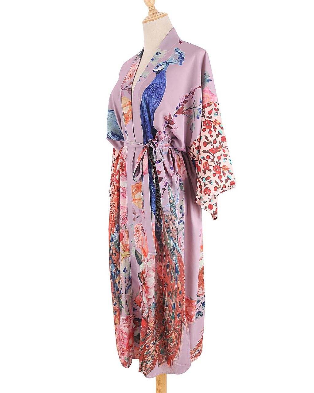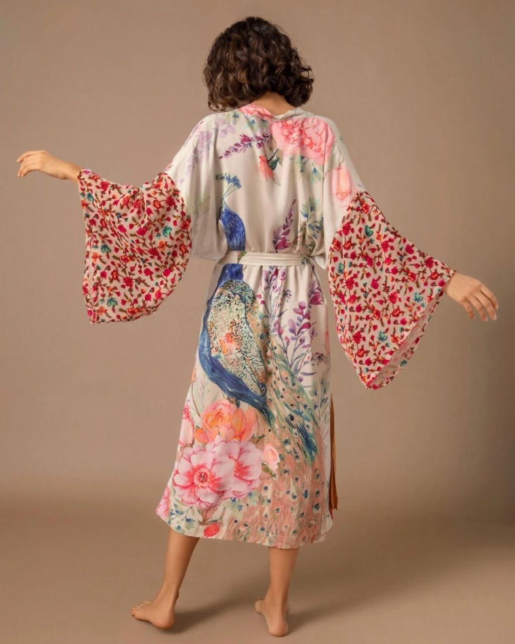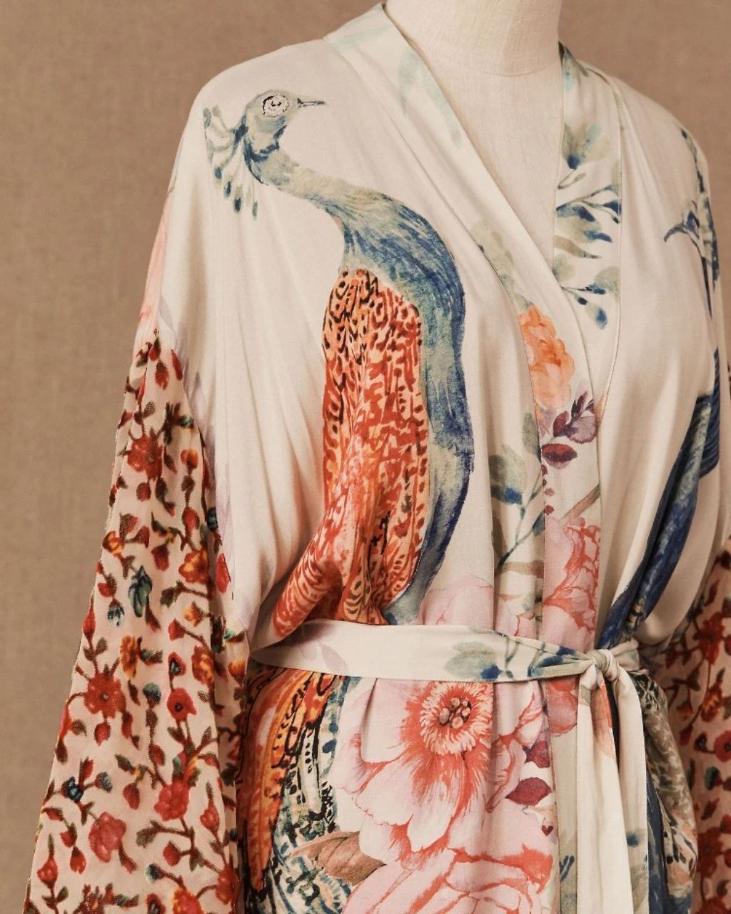 Confectionné dans une matière douce et légère, ce kimono long à imprimé paon vous offre un confort absolu. Sa texture fluide et agréable glisse sur votre peau, pour vous offrir une sensation de bien-être unique.