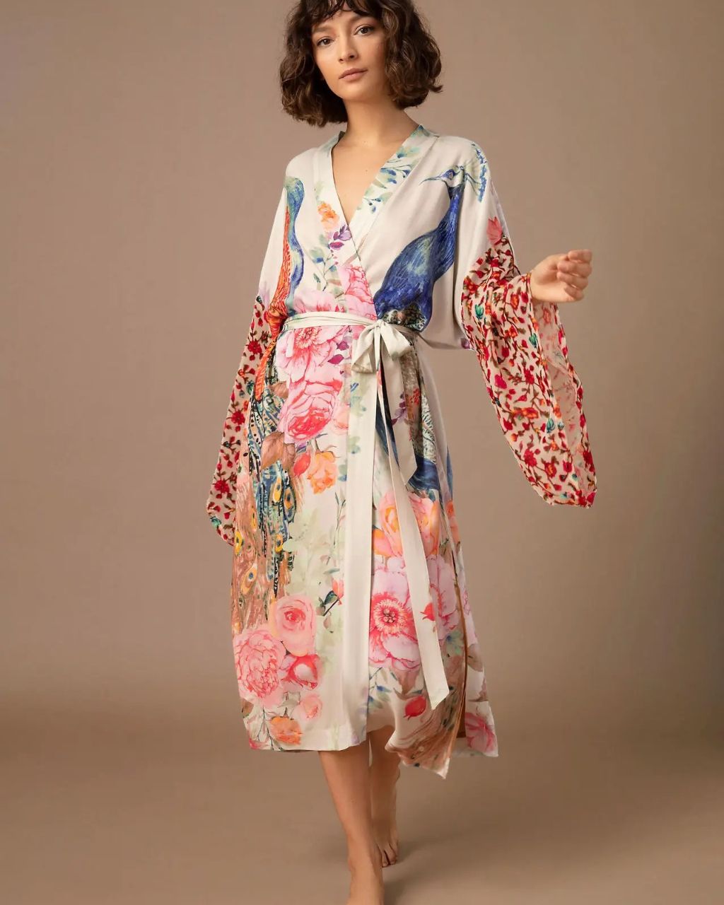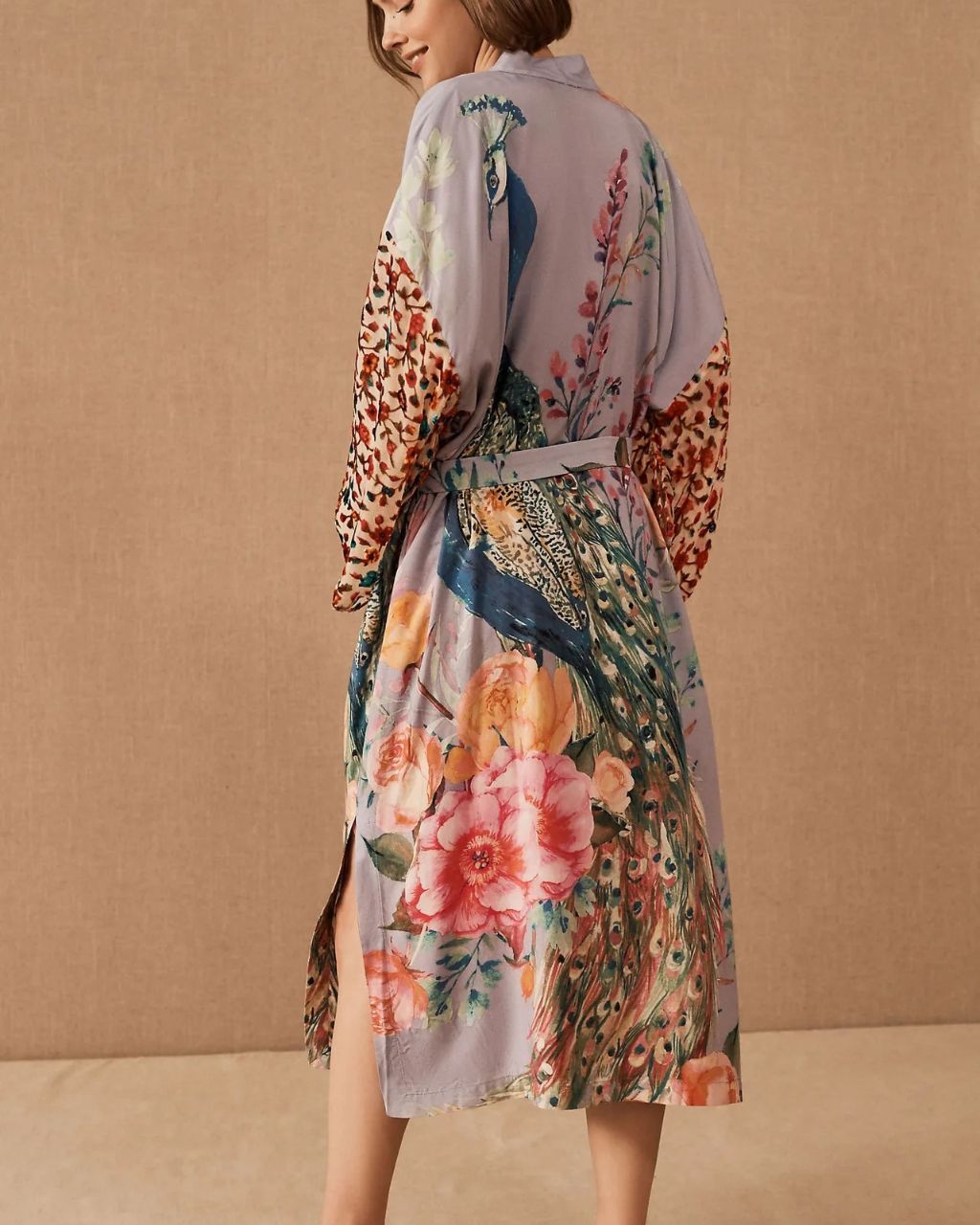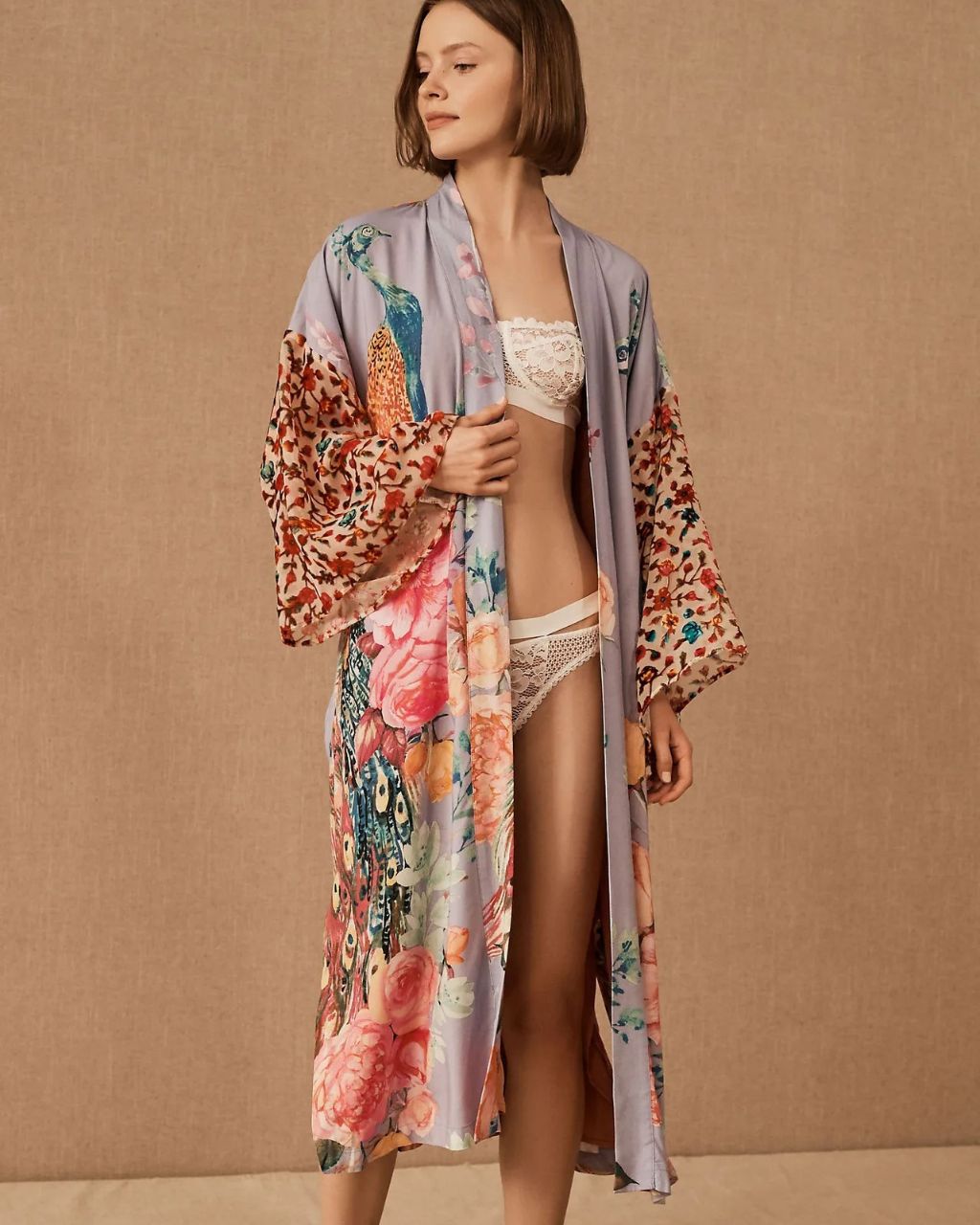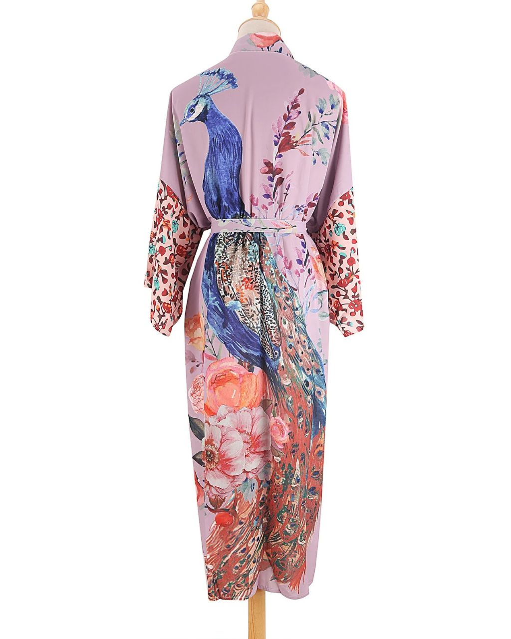Confectionné dans une matière douce et légère, ce kimono long à imprimé paon vous offre un confort absolu. Sa texture fluide et agréable glisse sur votre peau, pour vous offrir une sensation de bien-être unique.