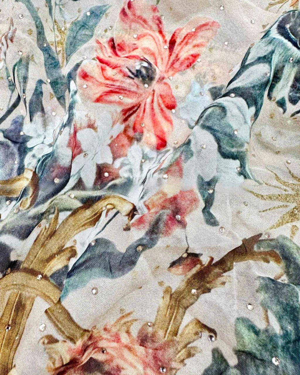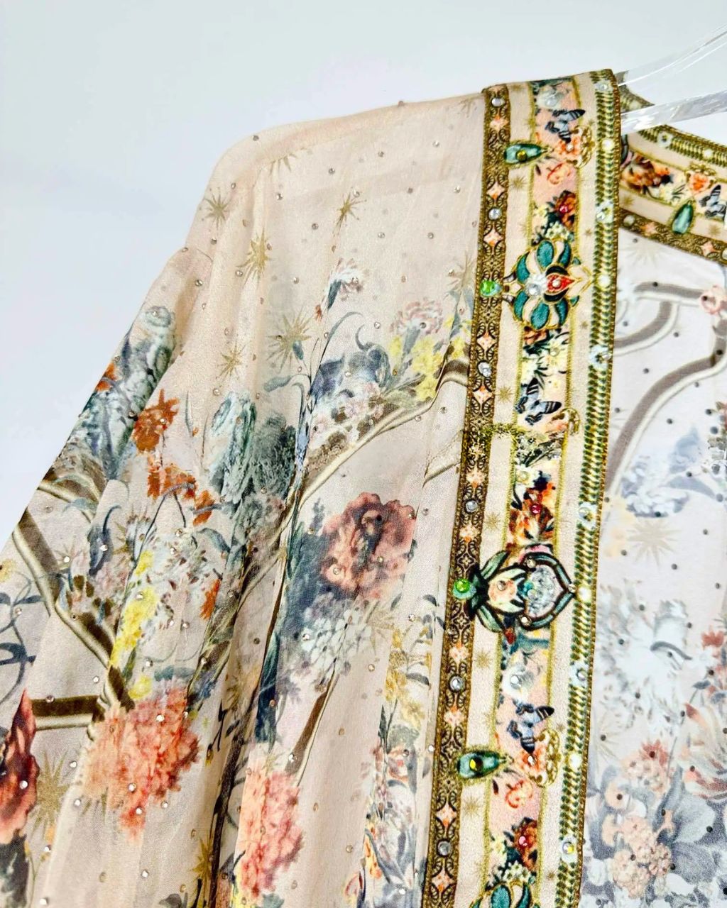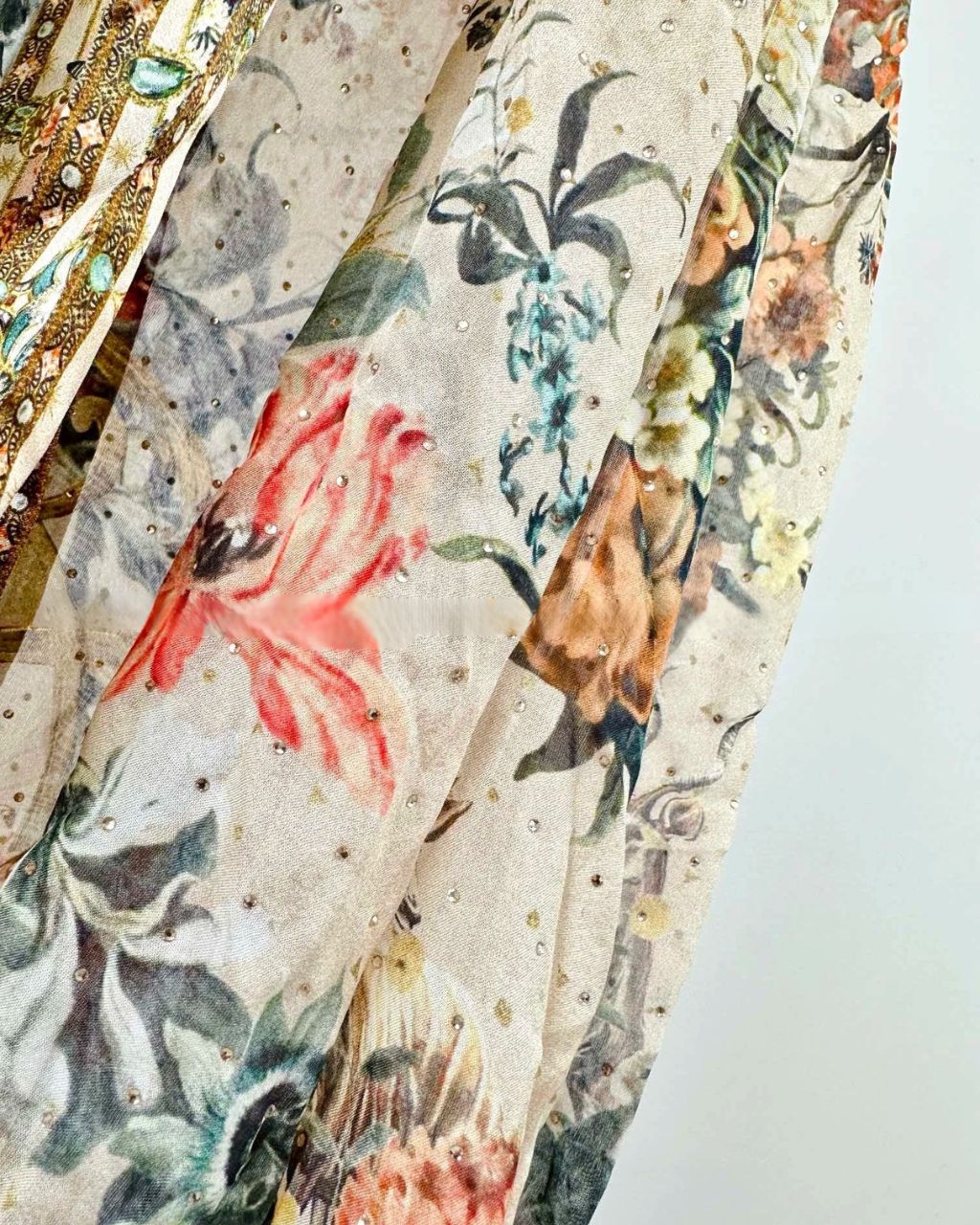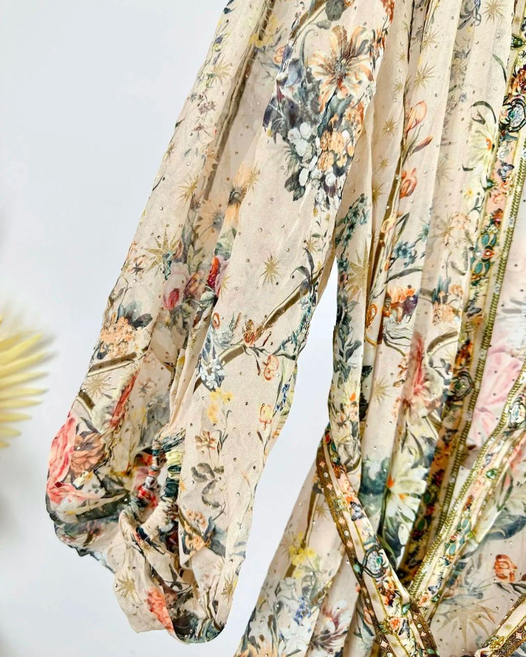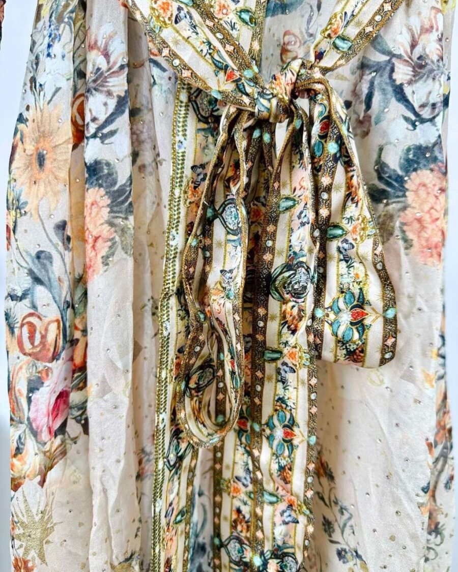 Le motif fleuri aux tons beige et délicats évoque une féminité subtile et assumée. Chaque fleur semble déposée avec soin, pour souligner votre présence avec raffinement ; et chaque détail évoque la délicatesse d’un matin paisible, où le temps semble suspendu.