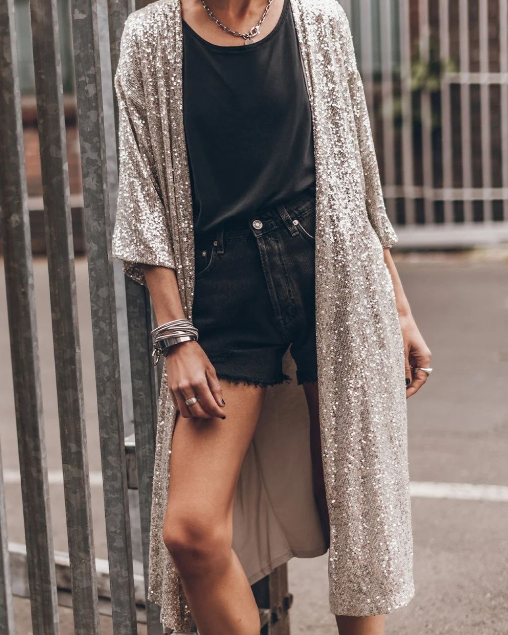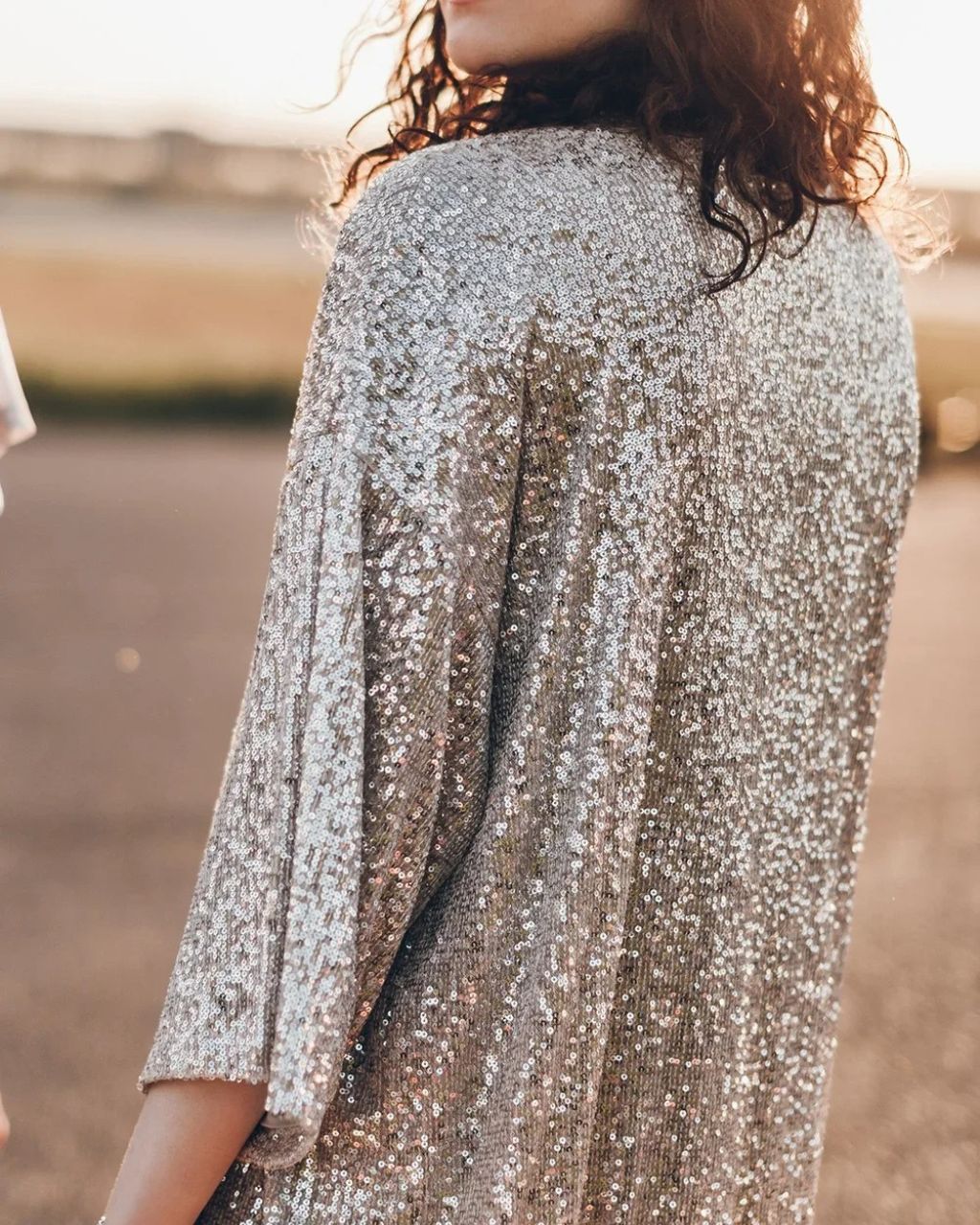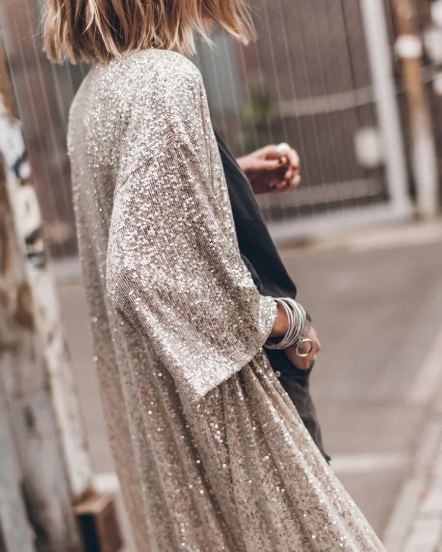 Enfilez cette veste kimono longue à sequins argentés, et sentez le changement. Comme une seconde peau étincelante, elle vous donne ce petit plus qui transforme votre posture, votre allure, votre énergie.