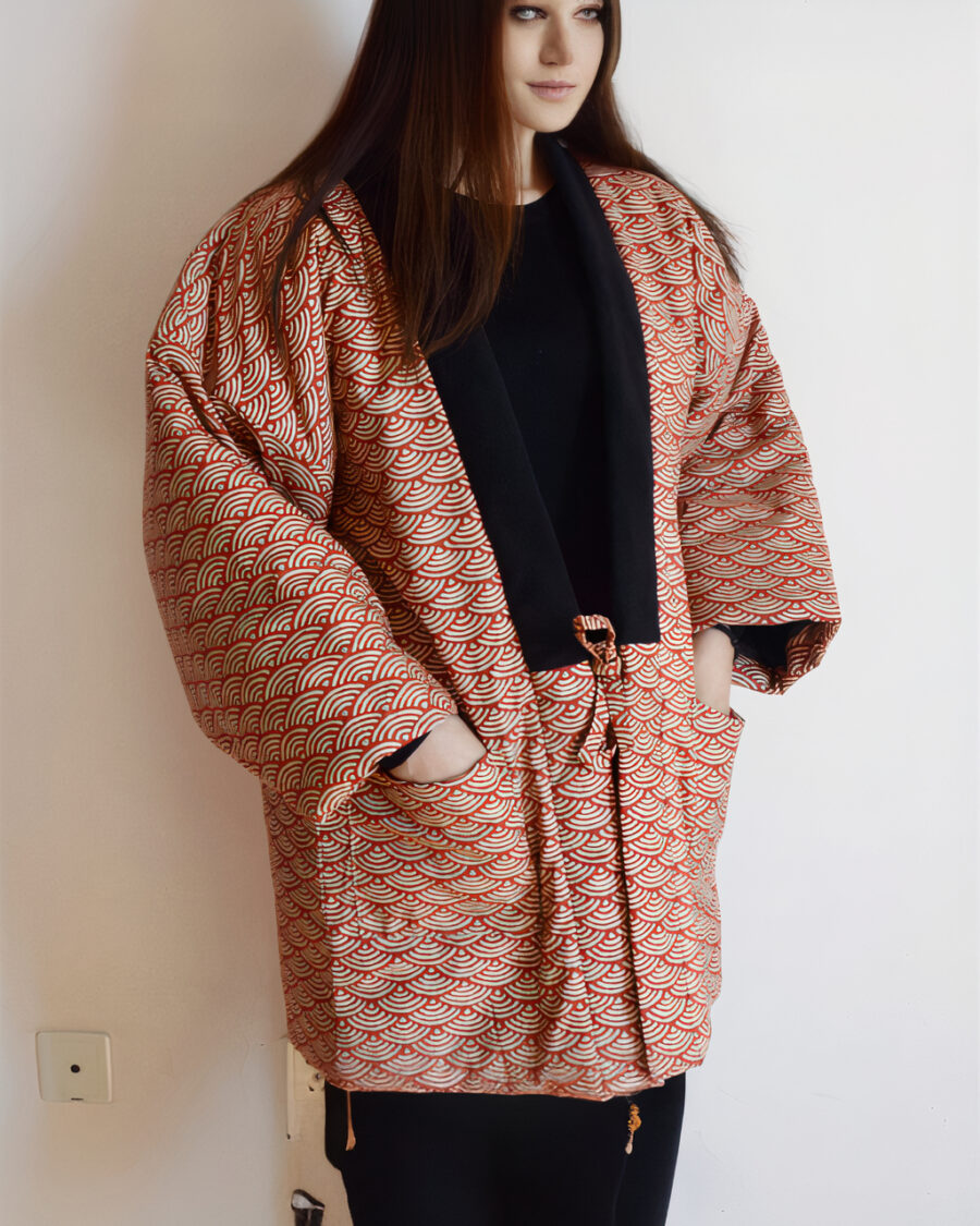 C’est la fin de l’été et vous ne savez plus comment vous habillez ? Optez pour un kimono qui vous fera aimer l’hiver ! Ce joli kimono imprimé avec des motifs japonais est une veste élégante et confortable. Le rouge est une couleur qui s’accorde facilement avec le jean et le noir par exemple.