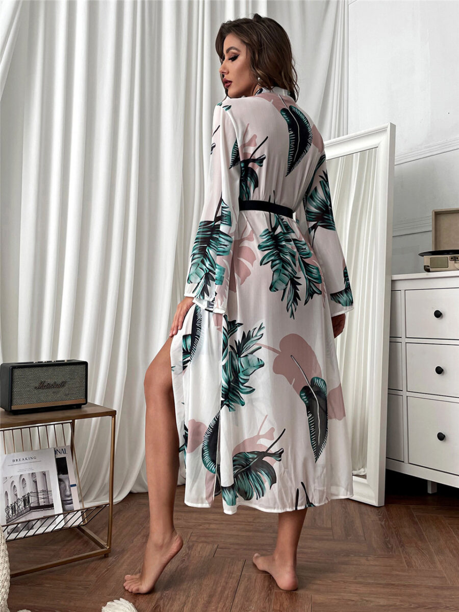Ce magnifique kimono en satin blanc est orné d’un motif feuille, pour un look à la fois élégant et intemporel. La ceinture assortie vient compléter l’ensemble avec une touche de couleur supplémentaire.
