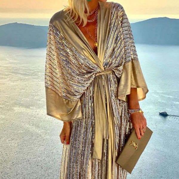 La robe kimono brillant avec ceinture est un vêtement élégant et sophistiqué qui convient parfaitement à toutes les occasions. Cette robe est conçue pour mettre en valeur la silhouette féminine tout en offrant un confort optimal grâce à sa coupe ample et fluide.