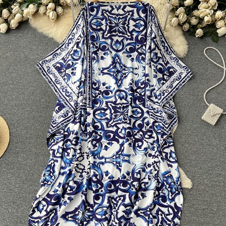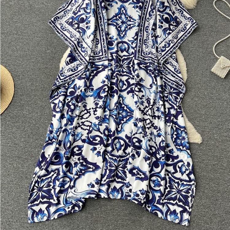 L’imprimé bleu sur fond blanc de cette robe est absolument magnifique, avec des motifs floraux et géométriques qui s’entrelacent harmonieusement. Les couleurs sont vives et éclatantes.