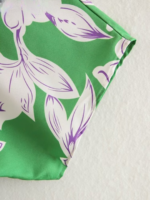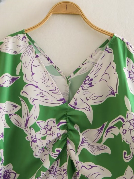 Le vert émeraude de la robe est sublimé par des fleurs violettes délicates qui apportent une touche de douceur et de romantisme à l’ensemble. La coupe kimono de la robe est ample et fluide, ce qui permet de camoufler les petites imperfections tout en mettant en valeur vos atouts.