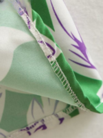 Le tissu vert doux et soyeux de cette robe est orné de magnifiques fleurs violettes délicates qui ajoutent une touche de couleur subtile et élégante à l’ensemble. Les manches larges et fluides rappellent le style traditionnel japonais du kimono, tandis que la coupe mi-longue flatte la silhouette et donne une allure chic et sophistiquée.