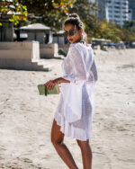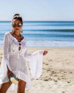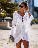 Voici la tunique de plage femme en dentelle ajourée au crochet. Cette tunique est parfaite pour les vacances à la plage ! Elle est fabriquée en dentelle ajourée au crochet, de quoi garantir un look féminin et chic. La tunique est semi-transparente, ce qui vous permettra de bronzer en toute sécurité. Elle est également légère et confortable, ce qui vous permettra de vous sentir à l’aise tout au long de la journée.